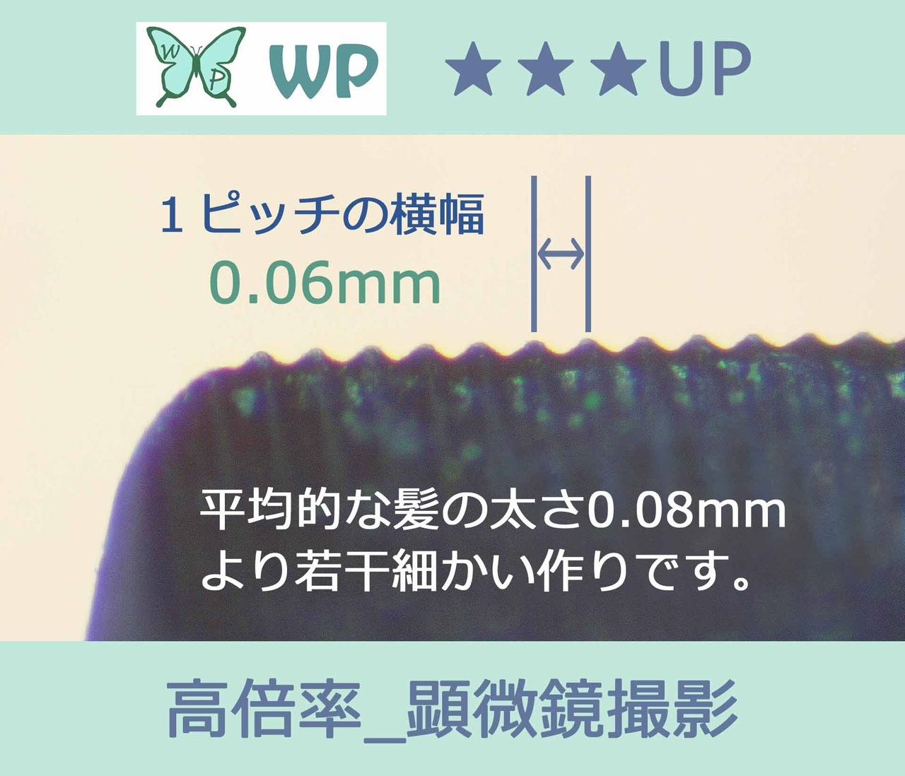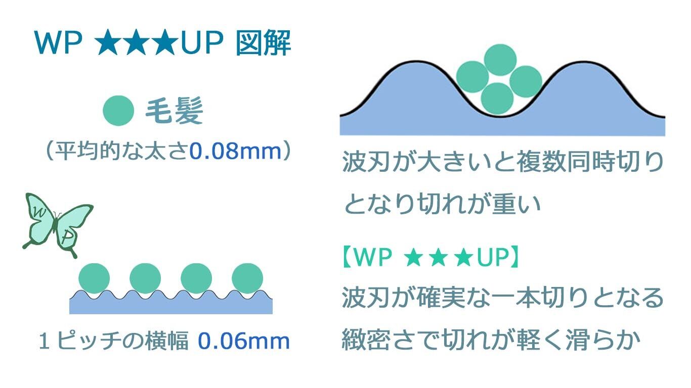 WPの波刃が適確に刃元部から毛髪を捉える為、有効に使える刃渡りはより長く感じていただけます。