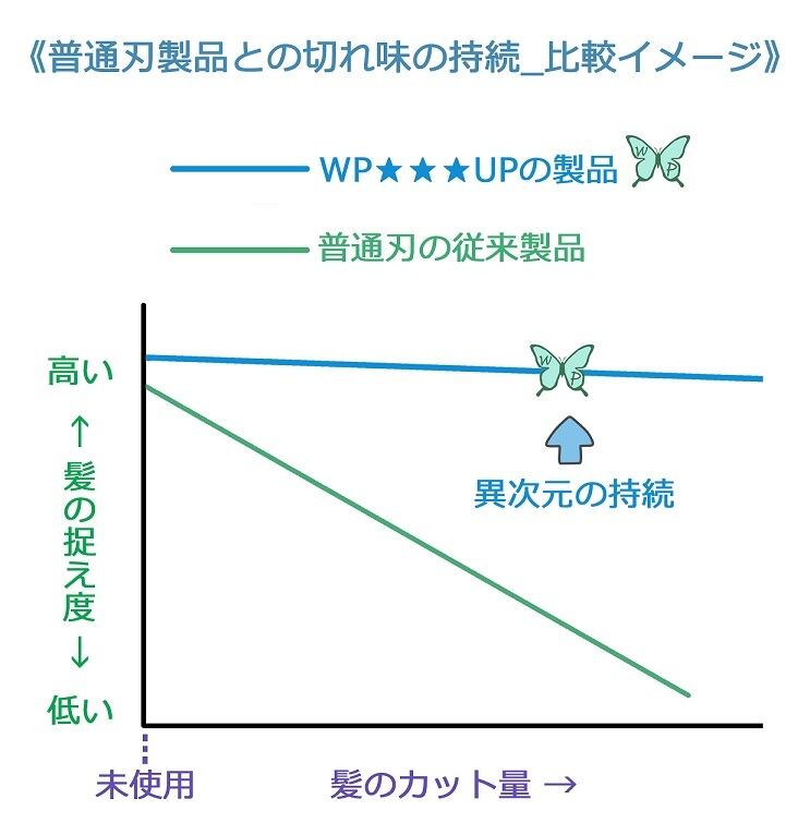 《緻密なWPの波刃により直鋏は極めて長期間、安定して良く効き続けます》