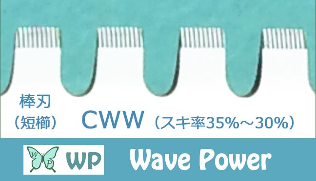 棒刃(単櫛)側にセニング仕様の緻密な超密波刃WavePowerの波刃があり、スキ率の圧倒的な長期間の持続とスムーズな操作感が特長です。